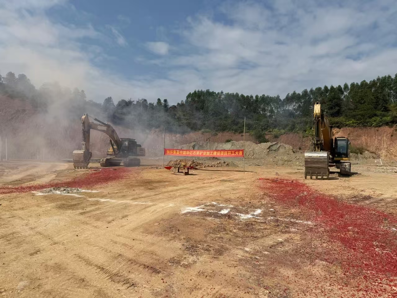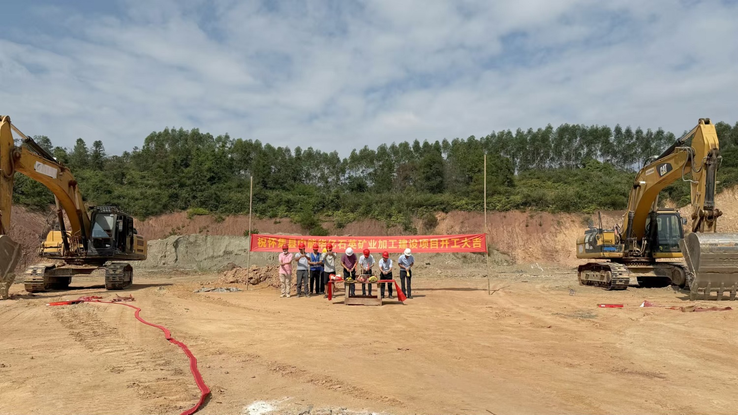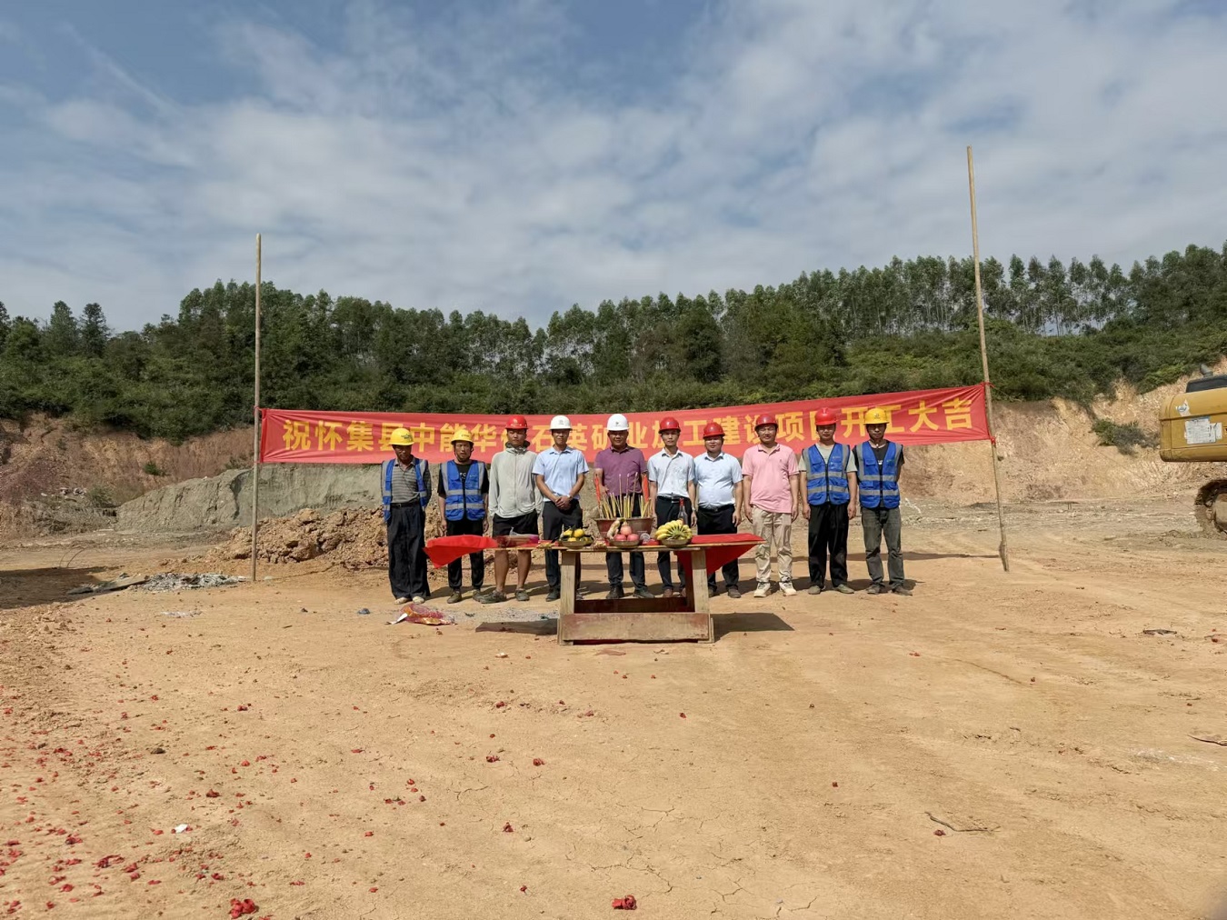 2024年11月5日,公司总经理黄炎铭带领公司管理团队人员前往肇庆市怀集县举行开工仪式,甲方公司代表陈总也来到现场一同祝贺项目的动工。随着机器轰鸣声响起,“中能华亿石英矿业加工建设项目”施工正式拉开序幕,起工动土,开工大吉!